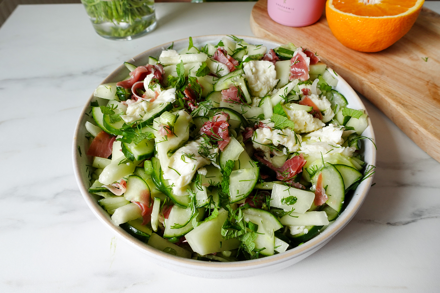 in Beilage, Salat Gurke-Melone-Salat mit Serrano und Mozzarella – Sommerlich leicht & figurfreundlich by Melanie Juni 12, 2025, 09:54