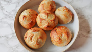 Den Teig in eine kleine Kastenform (15cm) füllen oder einen Brotleib formen und ungefähr 30 Minuten backen bis es goldbraun ist (sollte es vorher schon den gewünschten Bräunungsgrad erreicht haben, mit Alufolie abdecken).