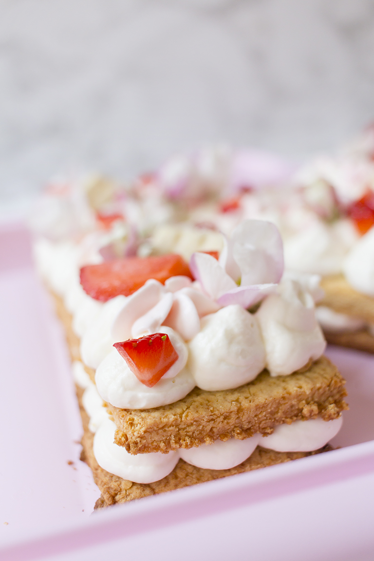 Für die Füllung die Sahne mit Xylit aufschlagen, dann Schmand und den Zitronensaft unterrühren. Die Masse in einen Spritzbeutel mit offener Spritztülle (z.B. Wilton 1A*) füllen, dann auf den ersten Buchstaben auftragen.