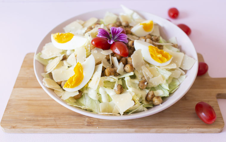 Die Eier kochen, Kichererbsen abgießen und mit etwas Öl und Gewürzen nach Geschmack (habe Paprika edelsüß, Oregano, Salz & Pfeffer genommen) anbraten, bis die Kichererbsen Farbe annehmen. Anschliessend zur Seite stellen.