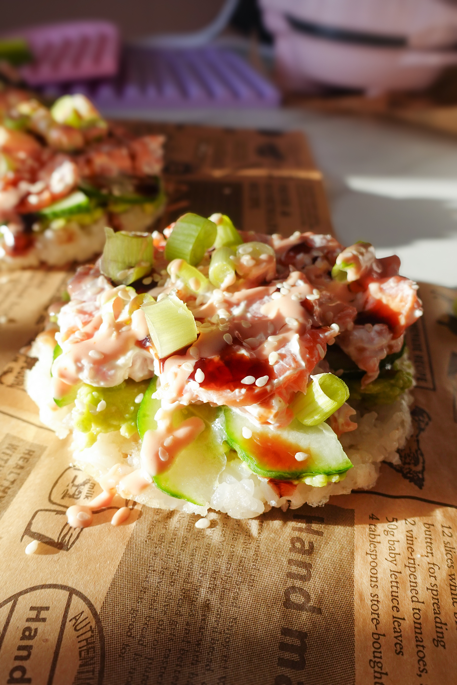 - Zum Anrichten die Reis-Waffeln zuerst mit Avocado bestreichen, Gurke darauf verteilen und die Lachsmischung darüber geben. Mit Frühlingszwiebeln und Sesam toppen und nach Geschmack mit Spicy Mayo und Sojasoße servieren.