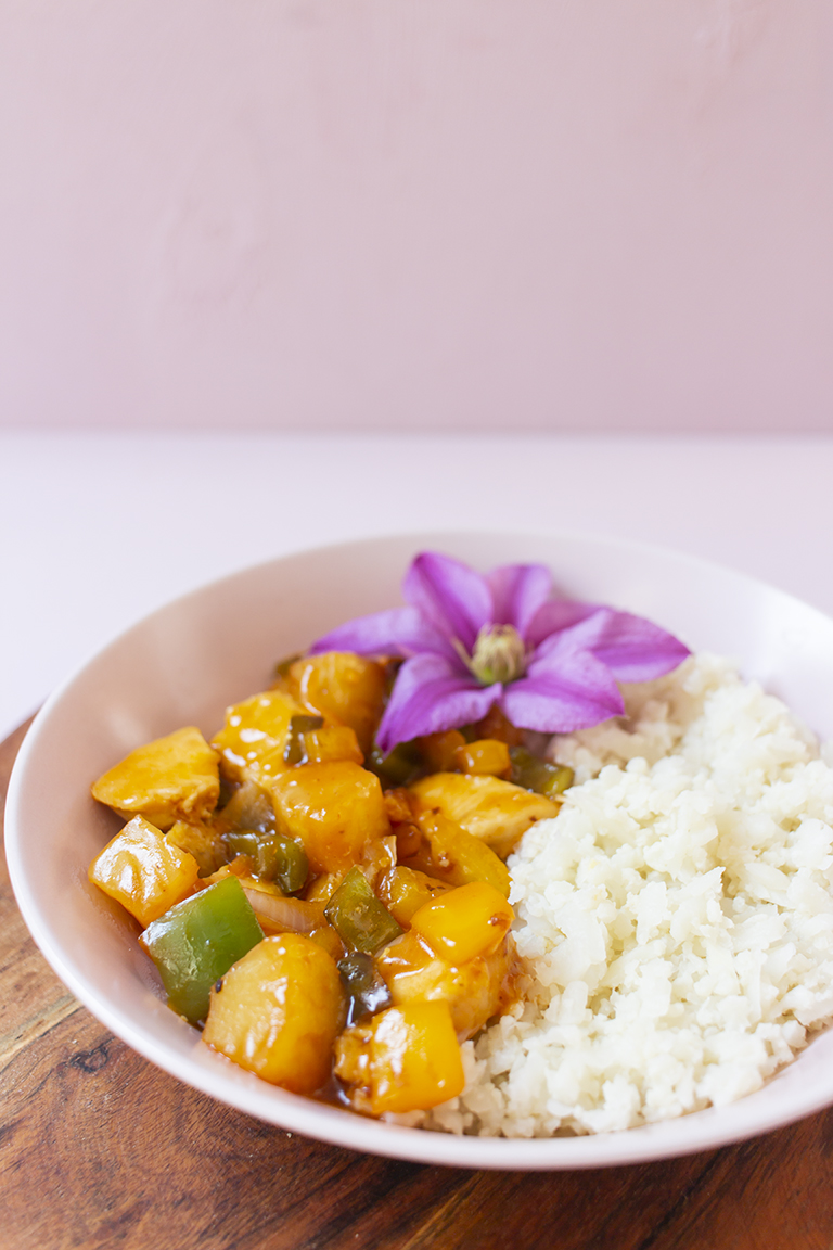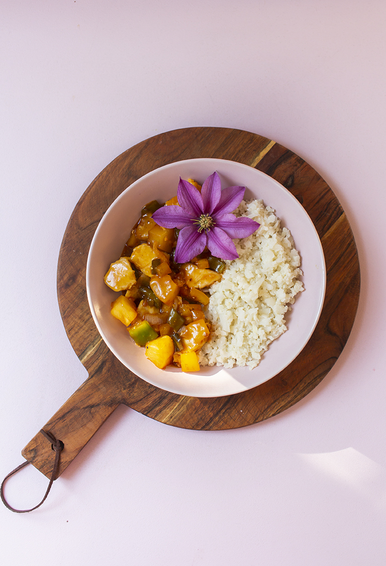 Zwiebel und Paprika schälen/vom Kerngehäuse befreien und klein schneiden, dann zusammen mit der Ananas in der Pfanne anbraten, bis die Zwiebeln glasig sind. Die Soße dazu geben und bei mittlerer Hitze köcheln lassen.