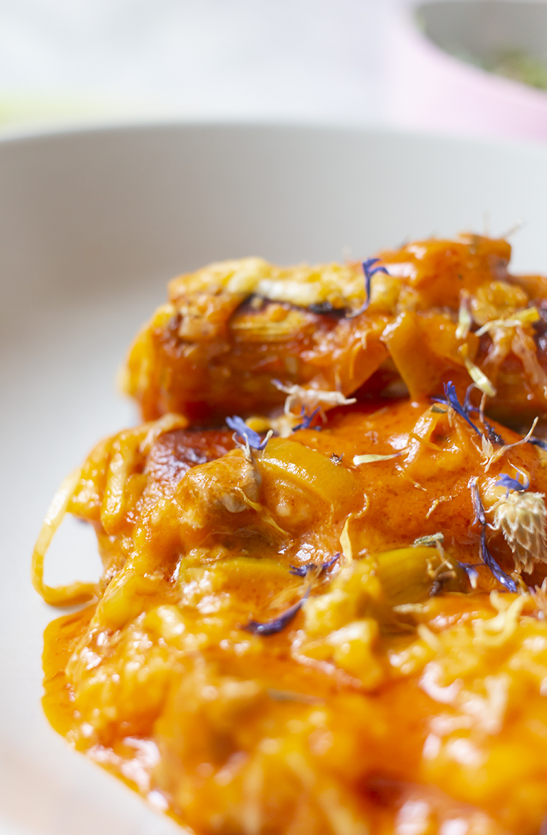 Für die Soße die Sahne, passierte Tomaten, Wasser, Paprika edelsüß, Kurkuma, Salz, Pfeffer und Guarkernmehl in eine Pfanne geben und zügig vermengen. Anschließend erhitzen, bis die Soße kocht und andickt. Schnittlauch und den restlichen, klein geschnittenen, Lauch dazu geben und vermengen.