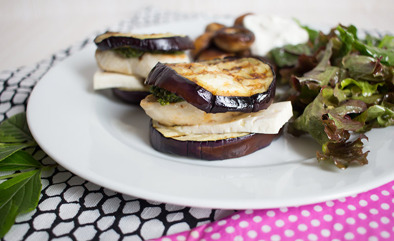 Die Aubergine ca. in 1cm dicke Scheiben Schneiden. Das Hähnchenfleisch in passend große Schnitzel schneiden und mit etwas Salz würzen. Die Aubergine von beiden Seiten mit Öl bestreichen. In einer Grillpfanne beides anbraten. Den Feta in Scheiben schneiden. Sobald die Aubergine von beiden Seiten gebräunt ist, eine Scheibe Feta auf jede zweite Auberginenscheibe legen und kurz weiter braten. Aus der Pfanne nehmen und mit einem Stück Hähnchenfleisch belegen, dieses mit Pesto bestreichen und eine weitere Scheibe Aubergine oben drauf legen. Mit Beilage nach Wunsch servieren und genießen, guten Appetit!