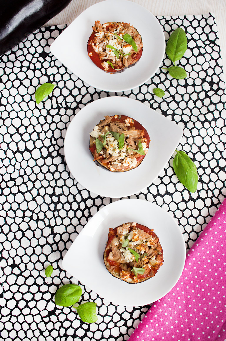 Den Ofen auf 180° Umluft vorheizen. Die Aubergine putzen und in Scheiben schneiden, dann auf ein mit Backpapier ausgelegtes Backblech legen. Die passierten Tomaten mit Oregano und Salz vermengen, anschließend ca. 1 EL auf die Auberginenscheiben streichen. Thunfisch und Feta darauf verteilen, nachwürzen und für ca. 10 Minuten in den Backofen geben. Servieren und genießen, guten Appetit!