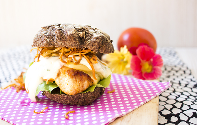 Die Schnitzel nach Geschmack würzen und anbraten. Kurz bevor ihr sie aus der Pfanne nehmt, den Käse drüber geben, damit dieser leicht anschmelzen kann. Anschließend mit den Brötchen, dem Salat, der Mayonnaise und den Pastinaken Fries servieren. Guten Appetit!