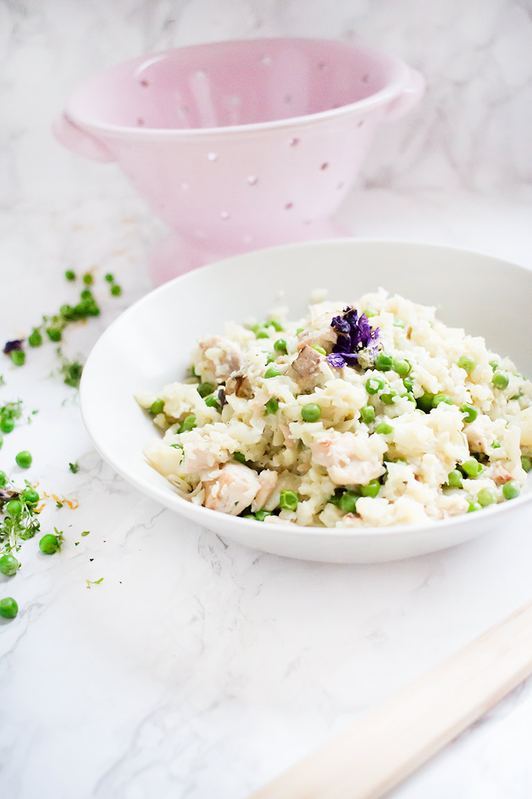 Den Lachs in Würfel schneiden. Die Zwiebel schälen, halbieren und in Ringe schneiden. Mit etwas Öl in eine Pfanne geben und anbraten, bis der Lachs gar ist. Mit Weissweinessig ablöschen. Dann den Blumenkohl, Erbsen, Kokosmilch, Salz, Pfeffer und Xylit hinzugeben. Ca. 10 Minuten unter rühren köcheln bis der Blumenkohlreis gar ist. Dann den Frischkäse und Parmesan hinzugeben und gut verteilen.