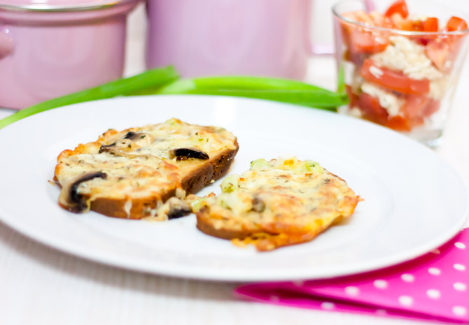 Die Brotscheiben auf ein mit Backpapier belegtes Backblech legen und den Ofen auf 200° vorheizen. Den Knoblauch schälen, sehr klein hacken und mit der Butter in einer Pfanne erhitzen. Derweil den die Champignons & Frühlingszwiebeln schneiden und zusammen mit dem Käse und der Petersilie in einer Schüssel vermengen. Das Brot mit der Knoblauchbutter beträufeln, darauf die Käsemischung geben und für ca 10-15 Minuten in den Ofen geben bis der Käse goldbraun ist. Bei Bedarf noch etwas Salz oben auf den Käse geben. Servieren und genießen, guten Appetit!