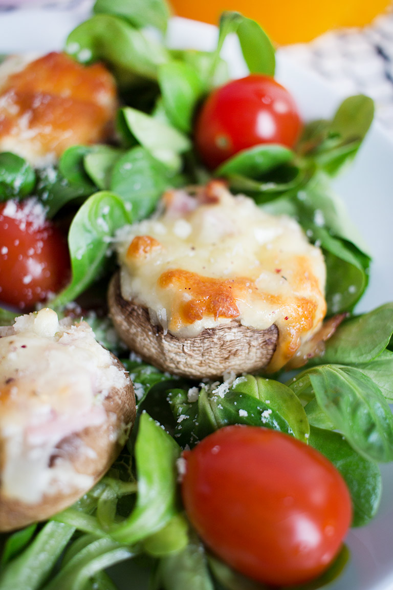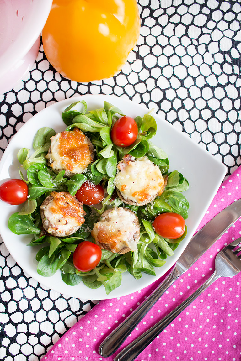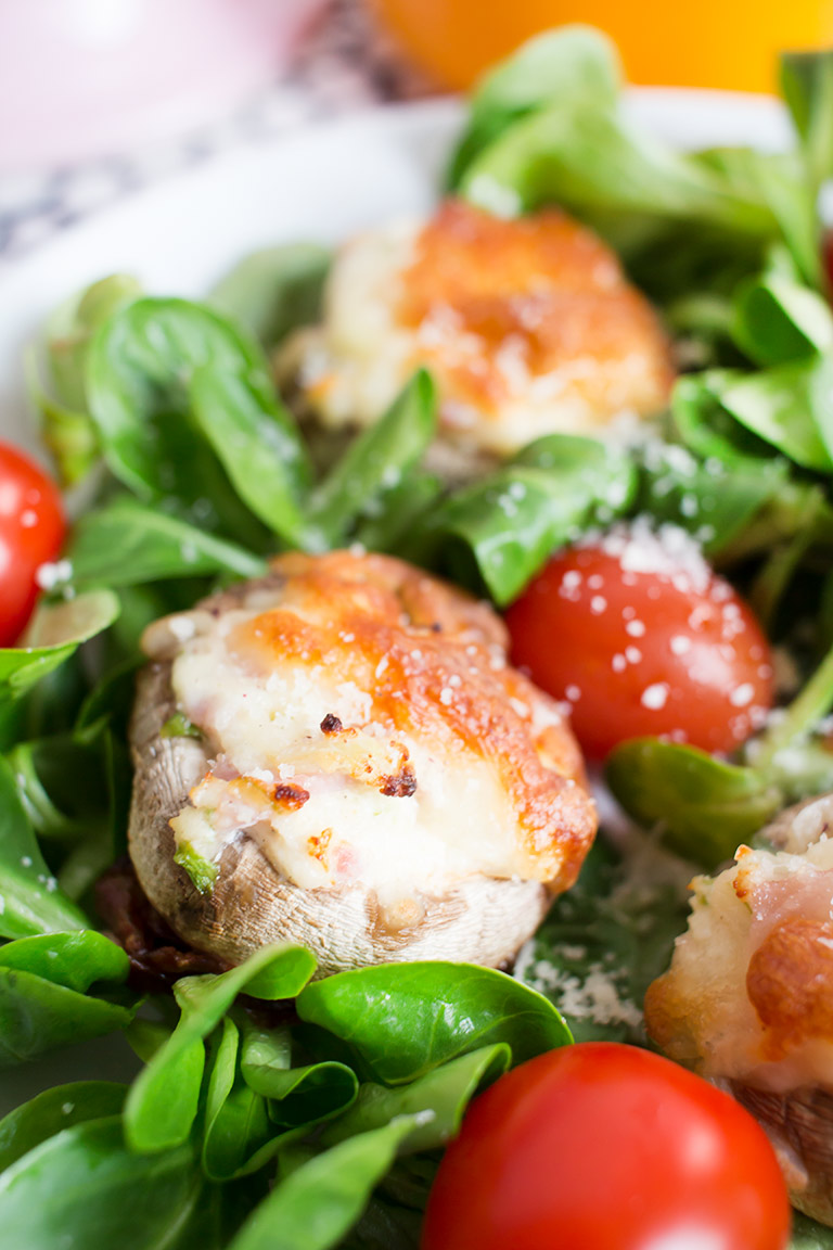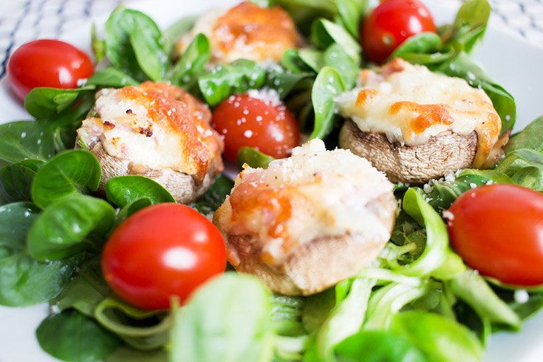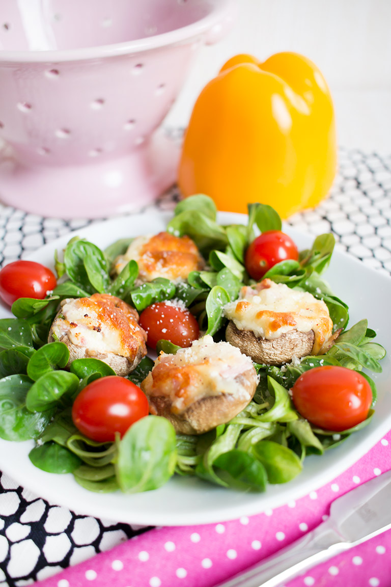Den Ofen auf 180° Umluft vorheizen. Die Champignons nach Bedarf putzen und die Stiele entfernen. Die Zwiebel und den Knoblauch schälen und klein schneiden. Diese mit den den restlichen Zutaten, außer dem Raspelkäse, vermengen und die Champignons damit befüllen. Den Raspelkäse darüber streuen, dann auf einem mit Backpapier ausgelegtem Backblech verteilen und für ca. 15 Minuten in den Ofen geben bis der Käse goldbraun ist.