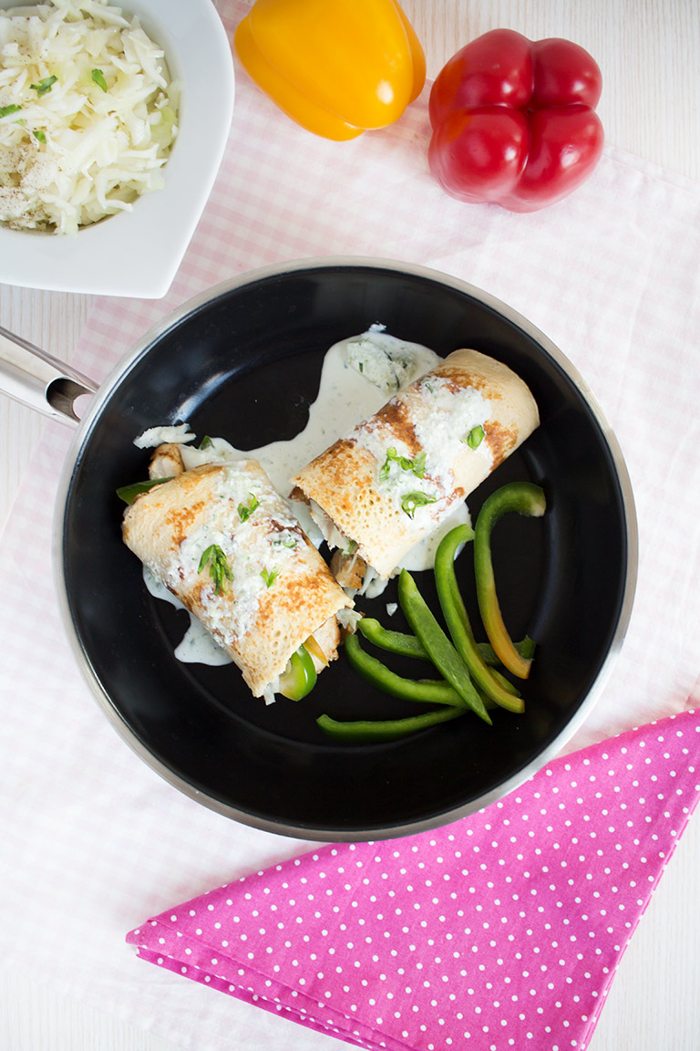 Nun den Krautsalat auf dem Crêpe verteilen, darauf das Fleisch, Paprikastreifen und die Soße. Servieren und genießen, guten Appetit!