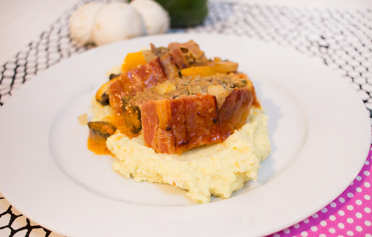 Derweil die Champignons putzen und in Scheiben schneiden, die Paprika entkernen und in Streifen schneiden. Nach den ersten 30 Minuten Champignons und Paprika um den Hackbraten verteilen und für weitere 20 Minuten backen. Deckel oder Alufolie entfernen, den Ofen auf 200° aufheizen und für weitere 10-15 Minuten in den Backofen geben, bis der Bacon braun ist.