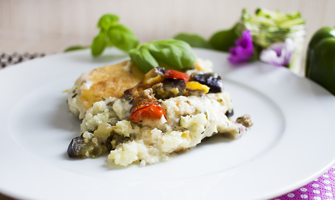 Den Ofen auf 170° vorheizen. Die Zwiebel schälen und würfeln, die Champignons, Paprika und Aubergine putzen und klein schneiden. Alles gemeinsam mit dem Hackfleisch, Salz und Pfeffer in eine Pfanne geben und anbraten bis das Hackfleisch gar ist.