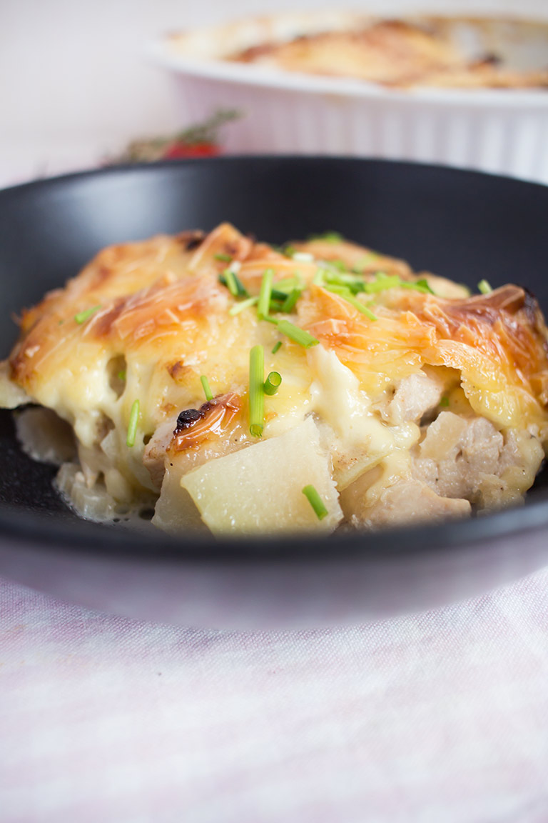 Nun in einer kleinen Auflaufform (20cmx20cm) schichten: zuerst Kohlrabi auf dem Boden verteilen, dann das Hähnchenfleisch, etwas Soße, wieder Kohlrabi, etc. bis die Zutaten aufgebraucht sind. Die Form dann für ca. 20 Minuten in den Ofen geben, dann den Käse darüber streuen und so lange backen, bis der Käse goldbraun ist.