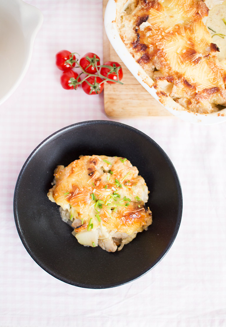 Nun in einer kleinen Auflaufform (20cmx20cm) schichten: zuerst Kohlrabi auf dem Boden verteilen, dann das Hähnchenfleisch, etwas Soße, wieder Kohlrabi, etc. bis die Zutaten aufgebraucht sind. Die Form dann für ca. 20 Minuten in den Ofen geben, dann den Käse darüber streuen und so lange backen, bis der Käse goldbraun ist.