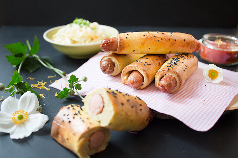 Sobald der Ofen vorgeheizt ist, den Teig aus dem Gefrierfach holen und mit eingeölten Händen in ca. 6 Portionen teilen. Daraus jeweils zuerst eine Kugel formen und dann eine längliche „Wurst“. Zwischen zwei Backpapieren flach ausrollen, eine Wurst darauf platzieren und zusammenrollen. Dann auf das Backpapier legen und mit den restlichen Teigportionen wiederholen. Anschließend den Teig mit Ei bestreichen.