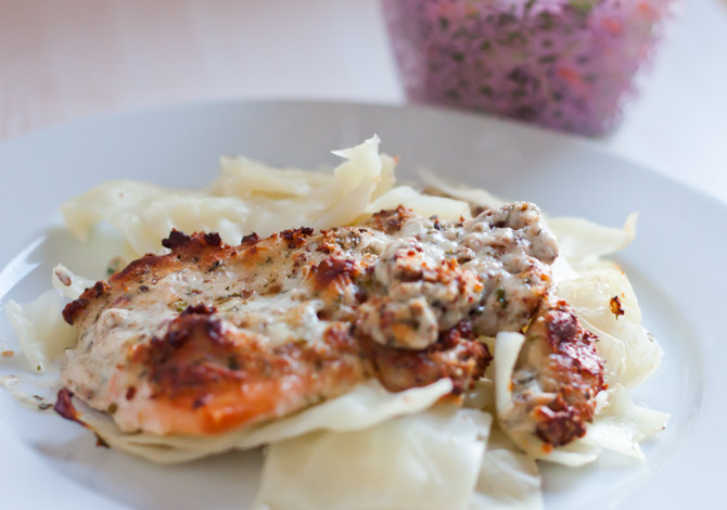 Den Lachs in den Ofen geben und auftauen. Den Weißkohl klein schneiden, mit Salz in einen Topf geben und gar kochen. Abgießen und in eine Auflaufform geben. Sobald der Lachs gar ist auf dem Weißkohl platzieren. Den Ofen auf 170° vorheizen. Das Eiweißbrot in einem Mixer zerkleinern und anschließend gemeinsam mit Crème fraîche, Parmesan, Meerettich, Zitronensaft, Petersilie, Salz und Pfeffer in eine Schüssel geben und miteinander vermengen. Den Lachs mit der Masse bestreichen und anschließend für ca. 20 Minuten in den Backofen geben. Servieren und genießen, guten Appetit!