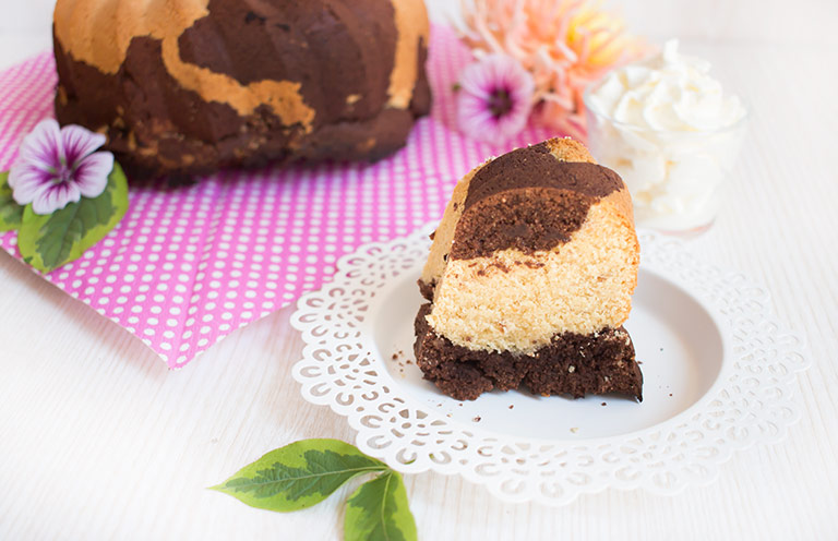 Die Masse halbieren und in eine Hälfte das Kakaopulver einrühren. In die Hälfte mit dem Kakaopulver die 100ml Mandelmilch einrühren. Nun abwechselnd einen Löffel der Kakaomasse und der hellen Teigmasse in die Form füllen, mit einem Messer Swirls einarbeiten.