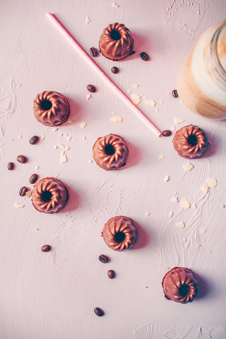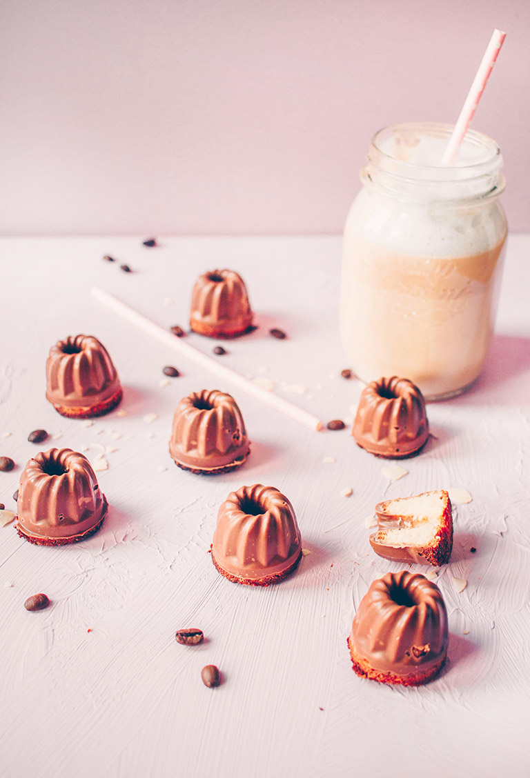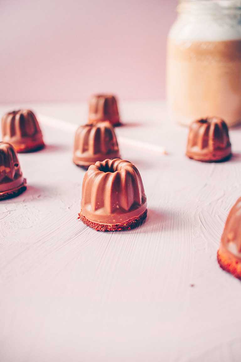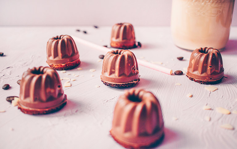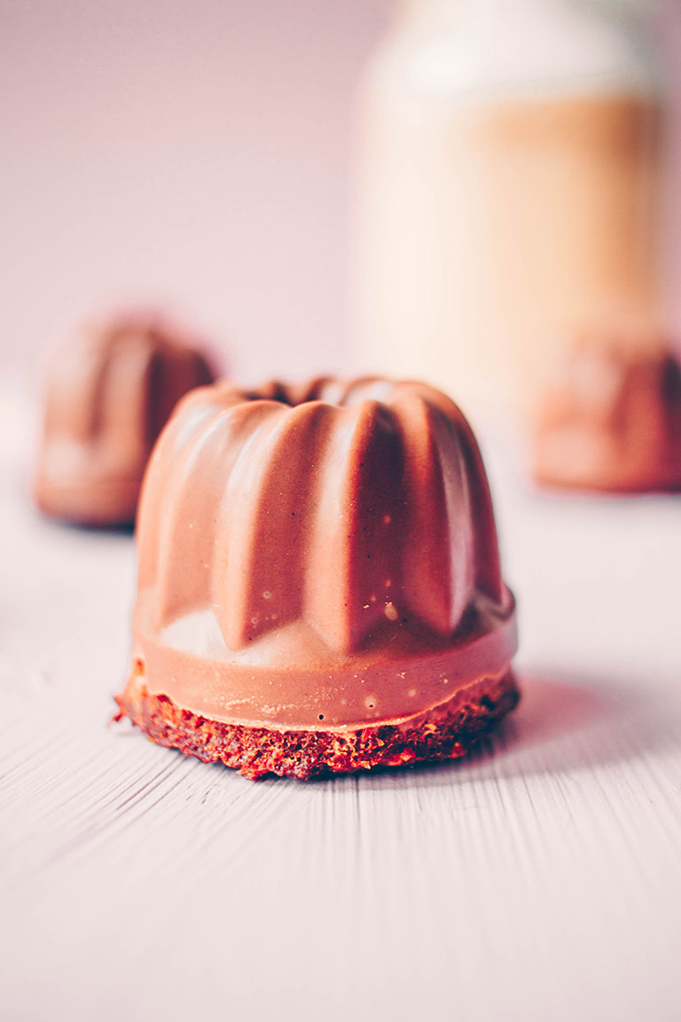 Sobald die kleinen Küchlein abgekühlt sind, die Schokolade über einem Wasserbad schmelzen. Diese dann in die Förmchen füllen und die Form hin und her schwenken, damit das komplette Innere der Form jeweils mit Schokolade bedeckt ist. Nun die Küchlein hineindrücken und für ca. 2 Stunden in den Kühlschrank stellen.