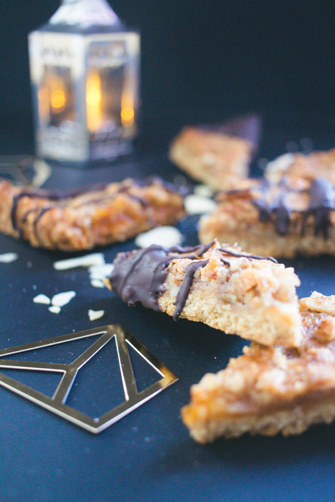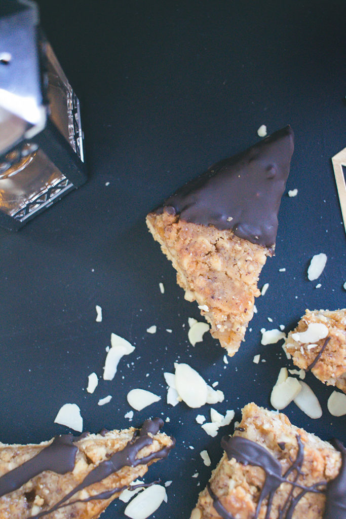 Anschließend zuerst in Rechtecke, dann in Dreiecke schneiden. Die Schokolade über einem Wasserbad schmelzen, dann die Nussecken hinein tauchen oder mit „Klecks“-Technik auf den Nussecken verteilen.