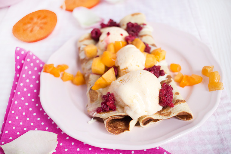 Für die Crêpe alle Zutaten in eine hohes Gefäß geben und miteinander vermengen. Etwas Teig in eine heiße Pfanne geben und mit einem Löffel dünn verstreichen. So lange backen, bis die Oberfläche nicht mehr flüssig ist, dann vorsichtig wenden und von der anderen Seite nur noch ganz kurz (wenige Sekunden) backen. Zu dem Eis servieren und genießen, guten Appetit!