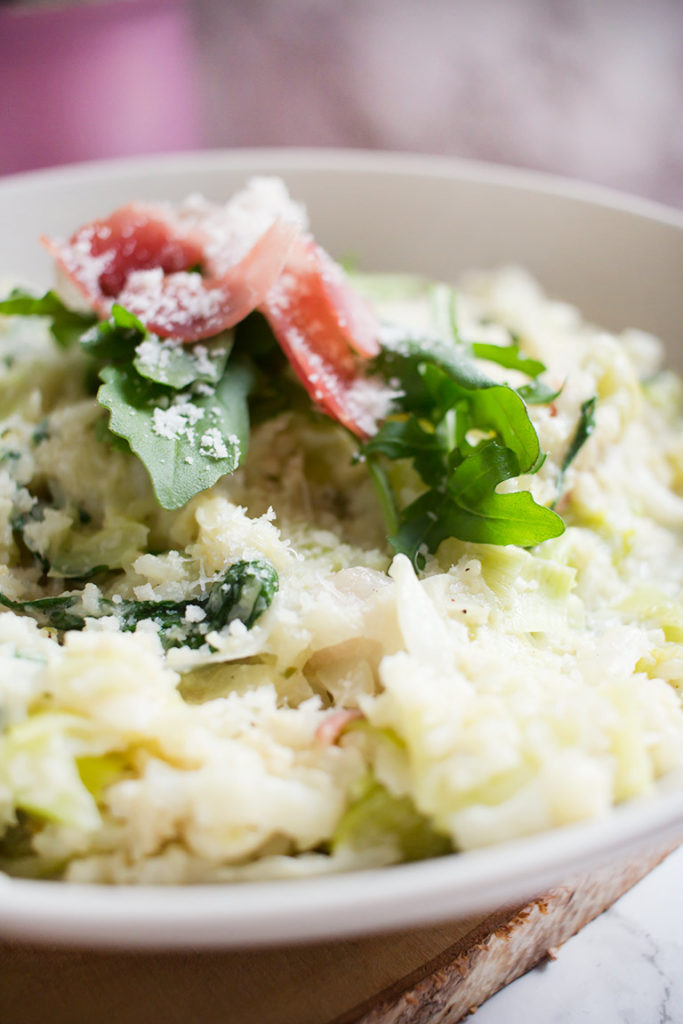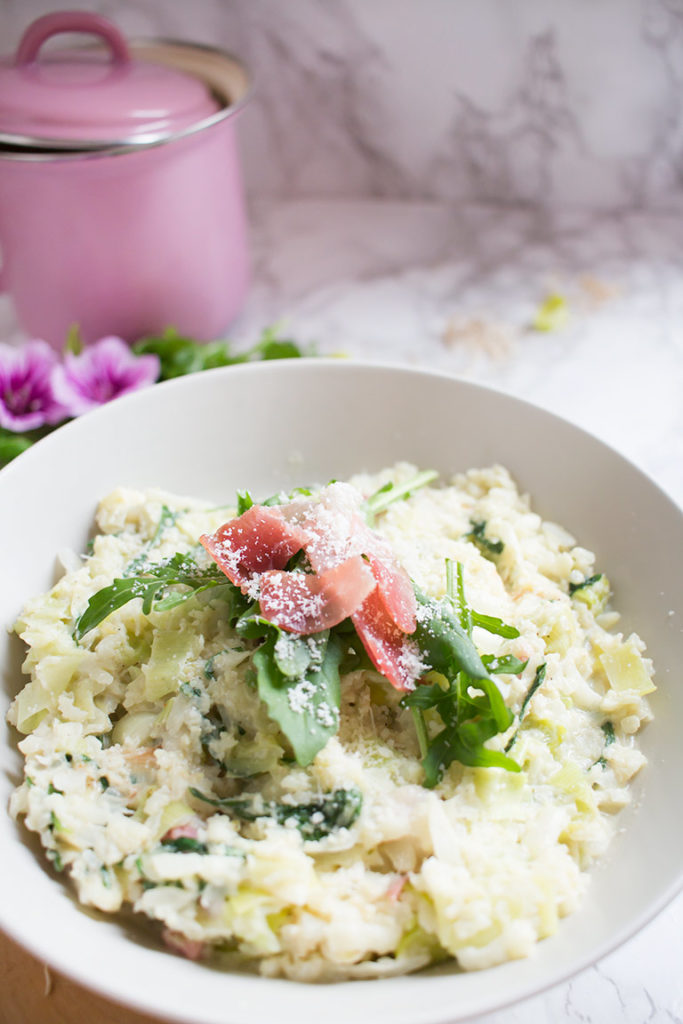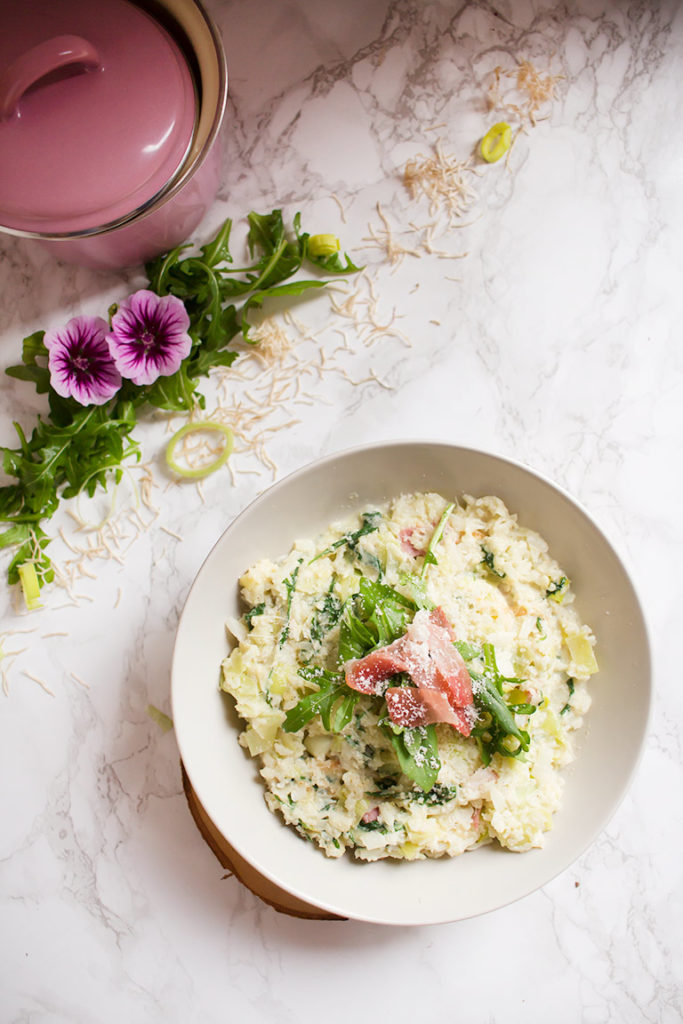 Etwas Öl in eine Pfanne geben und erhitzen, Lauch und den Knoblauch hinein geben und für ca. 5 Minuten bei mittlerer Hitze anbraten. Dann den zerkleinerten Blumenkohl, die Milch, Brühe, Salz & Pfeffer hinzugeben und bei mittlerer Hitze für ca. 15 Minuten weiter garen. Dann die Hälfte des Rucola sowie Creme Fraiche und Parmesan unterheben. Weiter garen, bis der Käse geschmolzen ist.