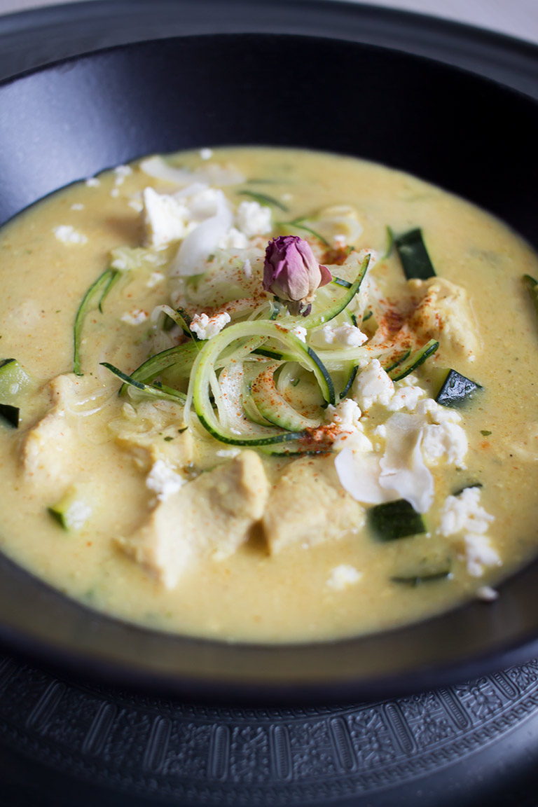 Die Zwiebel-/Ingwer-/Topinamburmischung mit Wasser, Kokosmilch, Sahne, Xylit, Kurkuma, Salz und Pfeffer aufkochen, Guarkernmehl mit einem Schneebesen einrühren, dann das Fleisch und die Zucchini dazu geben. Nochmal aufkochen lassen, abschmecken und servieren. Guten Appetit!