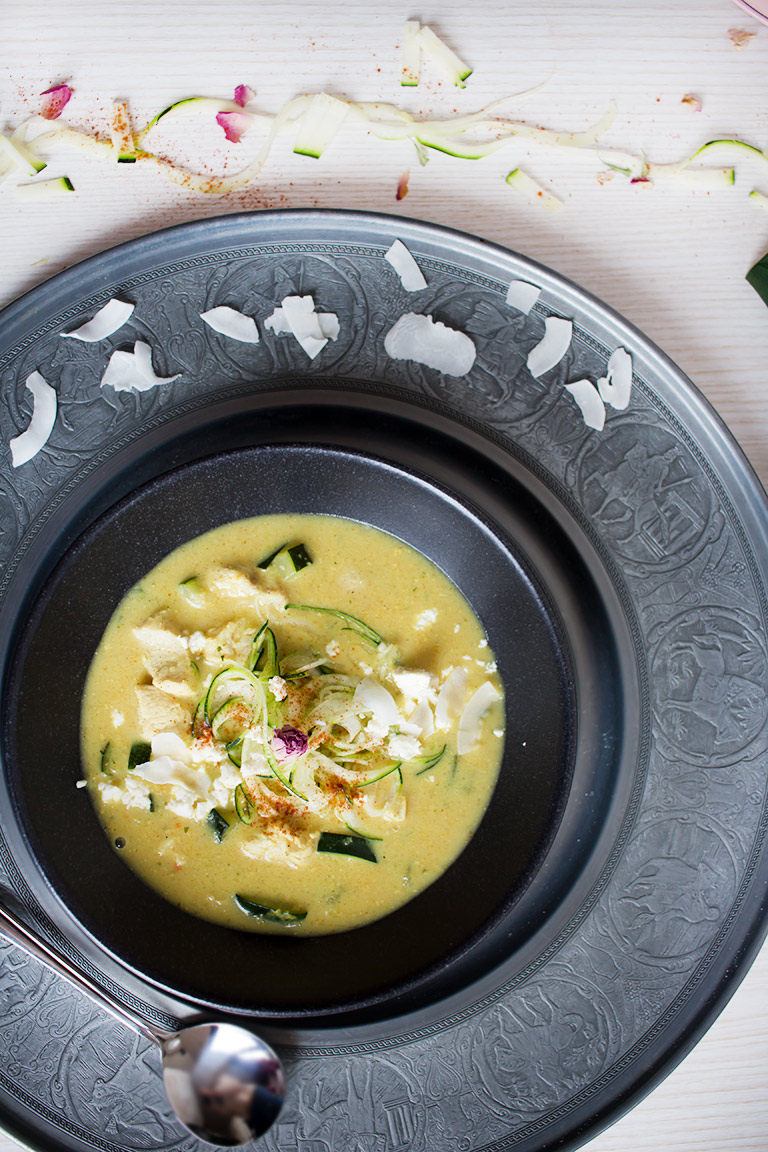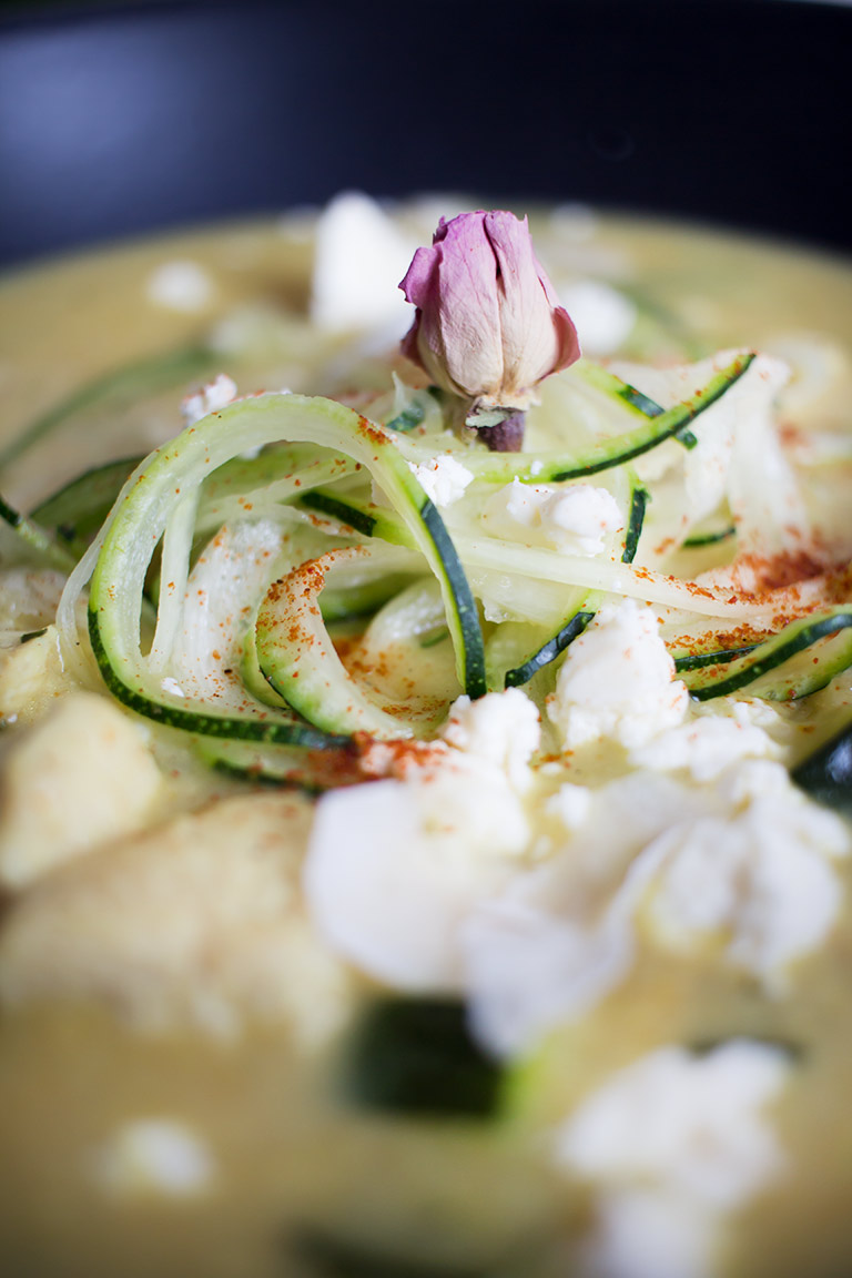 Die Zwiebel-/Ingwer-/Topinamburmischung mit Wasser, Kokosmilch, Sahne, Xylit, Kurkuma, Salz und Pfeffer aufkochen, Guarkernmehl mit einem Schneebesen einrühren, dann das Fleisch und die Zucchini dazu geben. Nochmal aufkochen lassen, abschmecken und servieren. Guten Appetit!