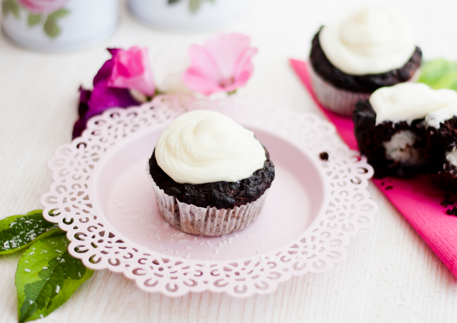 Die Eier trennen und das Eiweiß steif schlagen. Die Schokolade schmelzen und zusammen mit den restlichen (auch das Eigelb) Zutaten in einer separaten Schüssel miteinander vermengen, anschließend das Eiweiß unterheben. Nun jeweils etwa 1/2EL Teig auf den Boden der Muffinförmchen geben und die Füllung zubereiten: Dafür die Kokosraspel, Kokosmilch und Xucker in eine Schüssel geben und gut miteinander vermengen (alternativ könnt ihr auch zuerst diese Bountys zubereiten und je eine Hälfte in den Teig geben). Die Schokolade in 6 kleine Stücke teilen. Nun zuerst die Kokosmasse auf den Teig geben, darauf ein Stück Schokolade, darauf nun wieder Teig. Nun die Muffinform für ca. 25 Minuten in den Ofen geben (mit dem Stäbchentest prüfen ob sie durch sind). Abkühlen lassen, derweil das Frosting zubereiten: