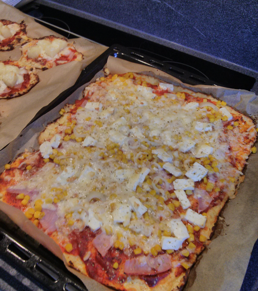 Den Blumenkohl sehr klein hacken (am Besten mit der Küchenmaschine, ich habe es mit einem großen Messer klein gehackt). Danach mit den Eiern und Käse vermengen und auf einem Backblech verteilen. Den Teig für 20Min bei 200 Grad backen und dann nach Geschmack belegen und für weitere 10-15 Minuten in den Ofen 🙂