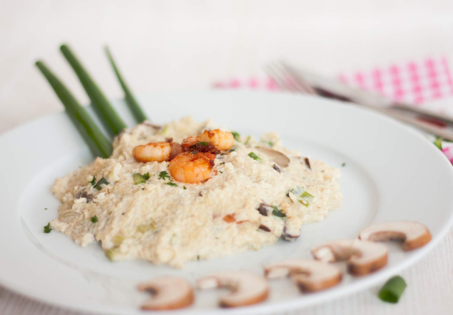 Derweil die Krabben zusammen mit klein geschnittenem Knoblauch in einer Pfann kurz anbraten. Die Krabben aus der Pfanne nehmen und zur Seite stellen (werden sonst zu trocken). Frühlingszwiebeln Champignons und Knoblauch schneiden und zusammen mit etwas Öl anbraten bis die Champignons goldbraun sind. Anschließend den Reis und Mascarpone, sowie Brühe (+Salz) hinzugeben und ca. 10Min einkochen. Nun noch die Krabben unterheben, abschmecken, fertig! Guten Appetit!
