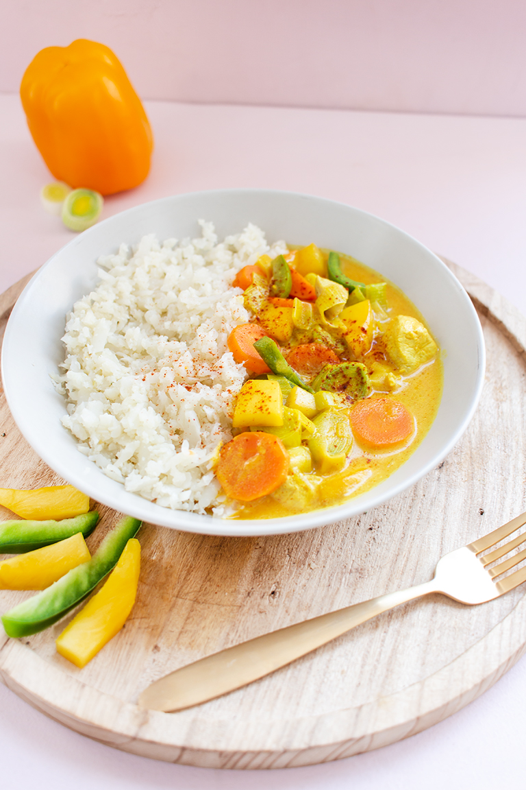Beispielsweise mit Blumenkohlreis servieren (Den Blumenkohl mit einem Mixer zerkleinern / grob raspeln (ich nutze dafür die grobe Raspelscheibe aus diesem Set*) und in einen Topf mit kochendem Wasser mit etwas Salz geben. Für ca. 10 Minuten garen, Wasser abgießen und fertig).