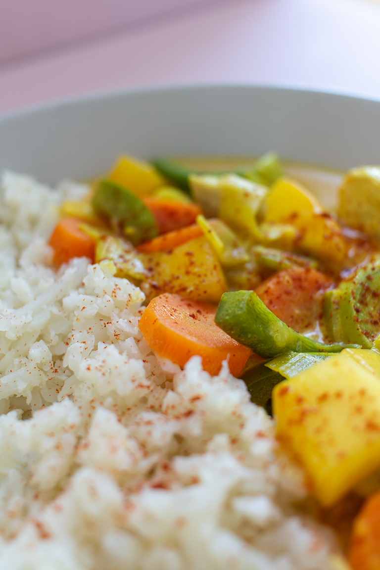 Für ca. 10 Minuten köcheln lassen, dann Wasser, Guarkernmehl und Gewürze hinzugeben und mit einem Schneebesen, so gut es geht, verteilen. Die Mango schälen und in Scheiben schneiden, dann ebenfalls in den Wok geben. Für weitere 20 Minuten bei mittlerer Hitze köcheln lassen, dabei mehrmals umrühren. Abschmecken (die Kokosmilch benötigt tendenziell immer etwas mehr Gewürze, meiner Meinung nach), bei Bedarf nachwürzen und genießen!