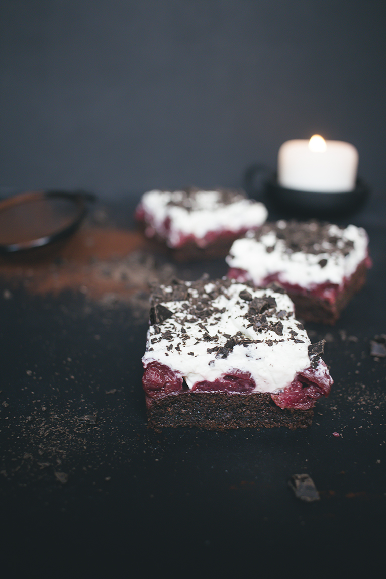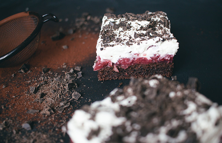 Anschließend die Sahne mit Xylit steif schlagen und auf der Kirschmasse verstreichen. Nun mit der Schokolade bestreuen.