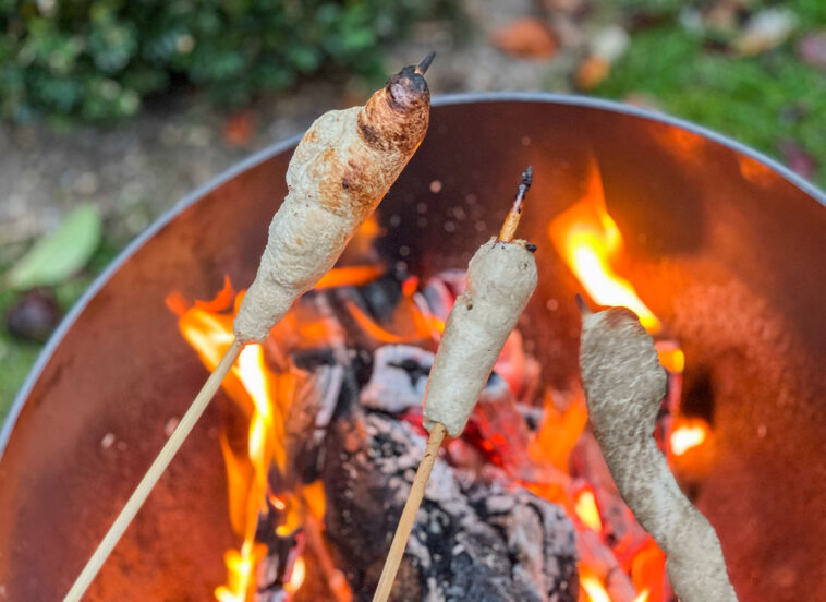 - Dann ca. 1 EL Teig pro Spieß nehmen und den Spieß damit umwickeln. Jetzt über dem Feuer garen, das dauert je nach Hitze der Glut/Flamme und Deiner gewünschten Entfernung ca. 10-15 Minuten.