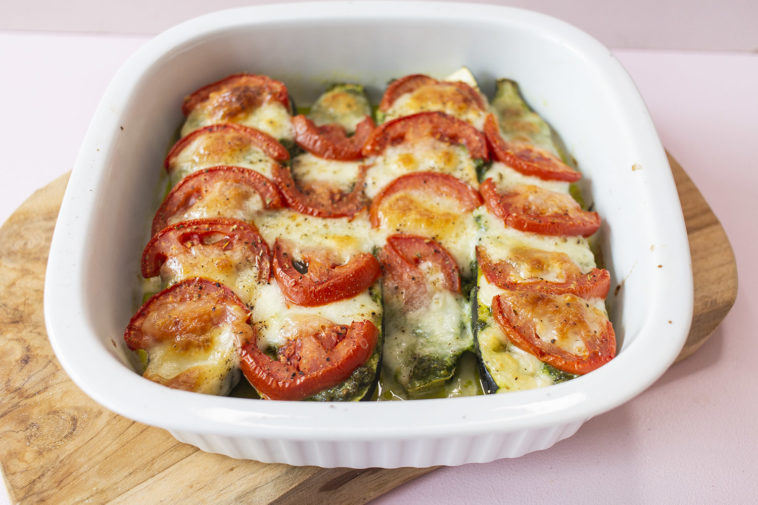- Mit Pesto bestreichen, abwechselnd mit Tomate und Mozzarella belegen, mit Salz, Pfeffer und Oregano würzen und für ca. 45 Minuten backen (die Backzeit kann je nach Größe eurer Zucchini natürlich variieren, am besten mit einer Gabel testen, ob die Zucchini weich ist).